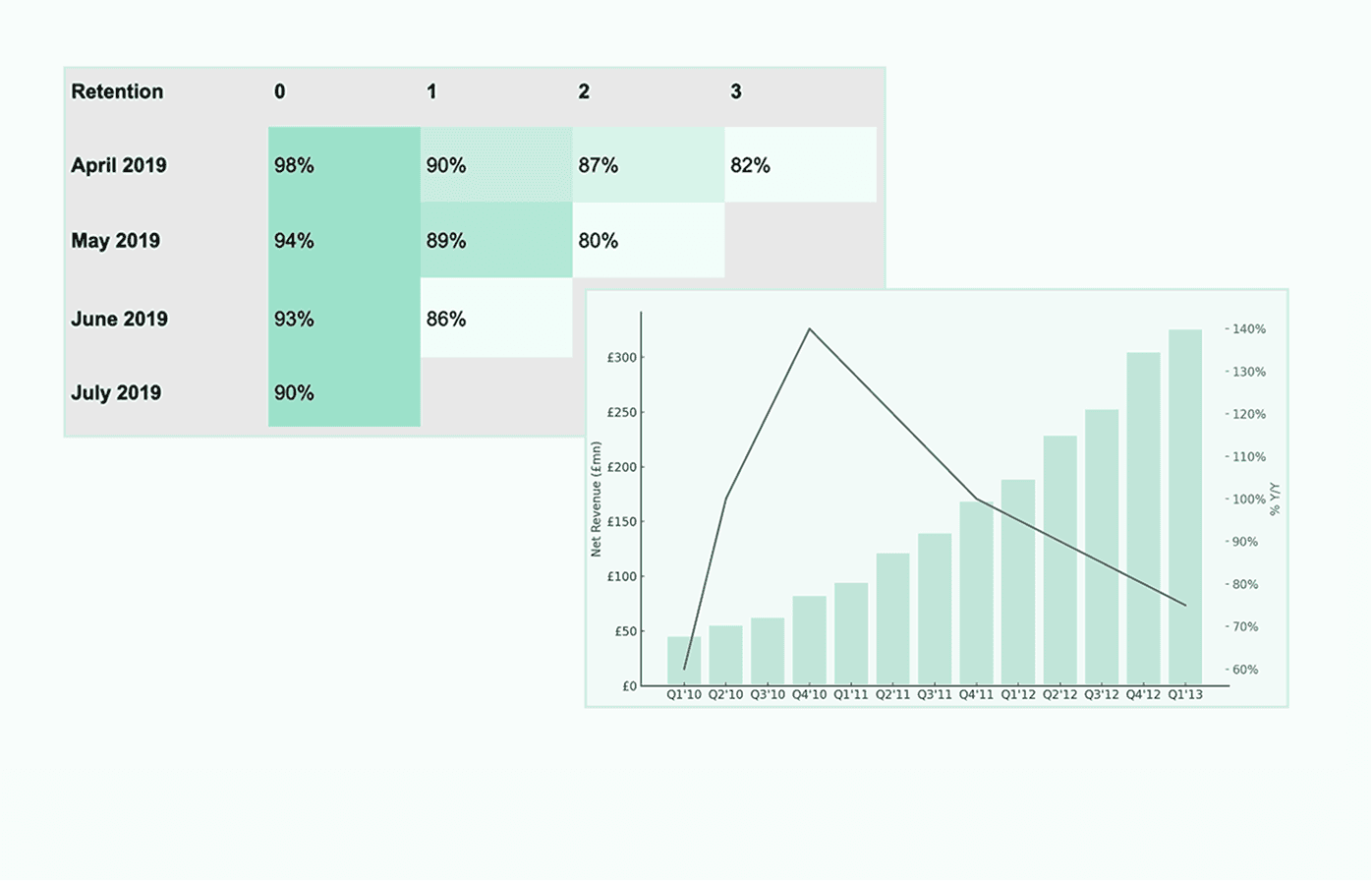 Dual-axis charts, cohort retention triangles, unlabeled graphs.