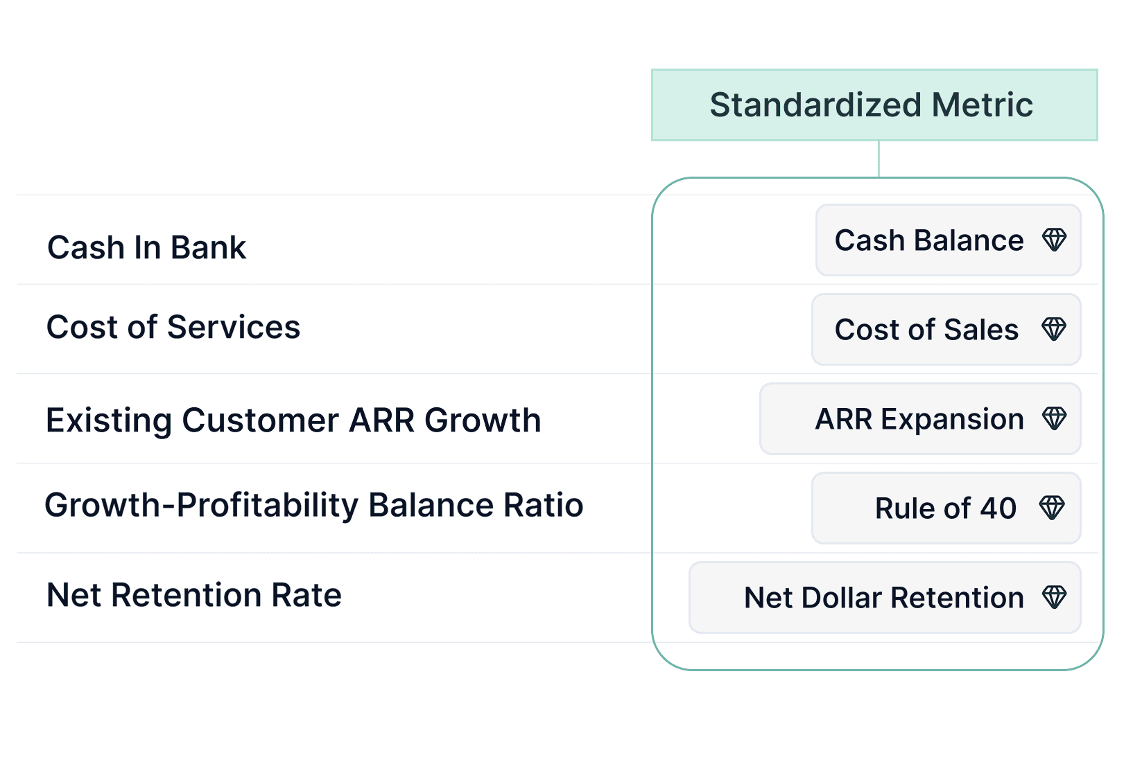 Standardization normalizes metric names, definitions, currencies and reporting periods. Waterfall calculations plug gaps.