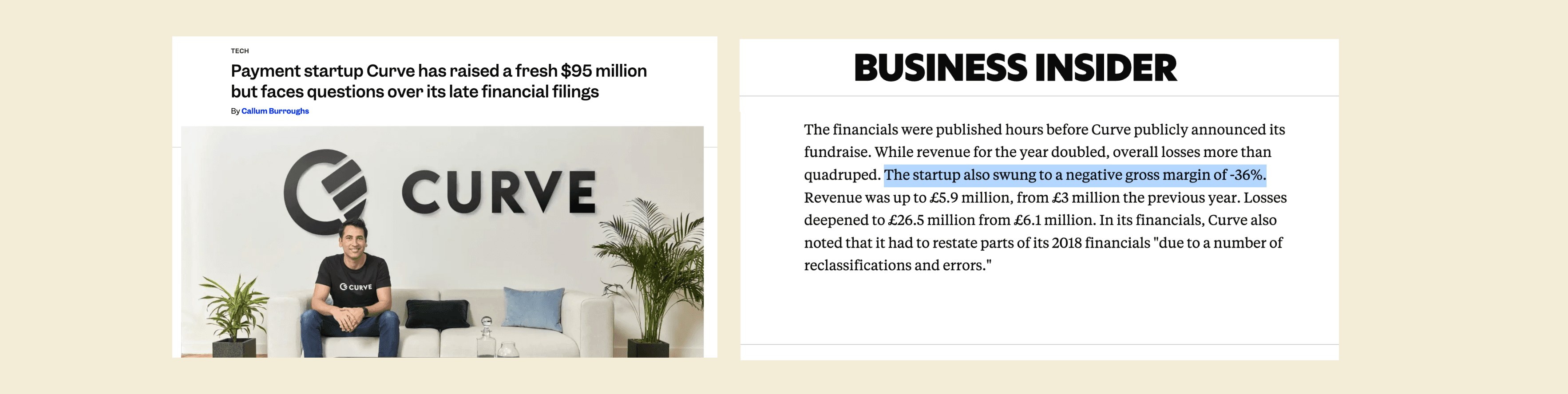Curve rebuilt entirely - adding subscription tiers, premium features, platform fees on top of low-margin card interchange. Negative gross margins require fixing unit economics: cut delivery costs or add higher-margin revenue. Curve did both.