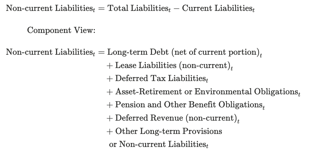 Non-current liabilities (long-term liabilities) are obligations the company does not expect to settle within 12 months (or the operating cycle, if longer). Think long-term debt, lease liabilities (non-current portion), deferred tax liabilities, long-term provisions, pensions, and deferred revenue due after a year.