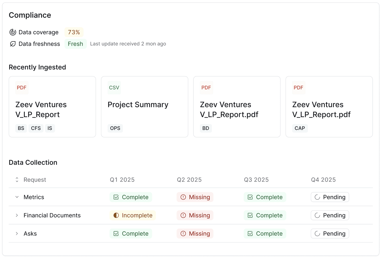 Data coverage and freshness shown by period, making gaps and pending updates immediately visible.