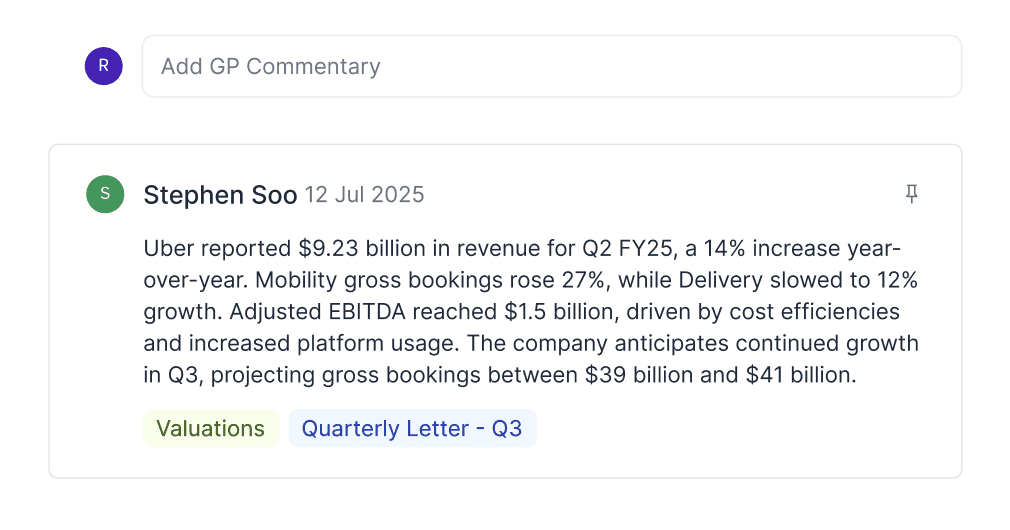 Company-level performance, ownership, valuations, documents, and notes, organized for faster review.