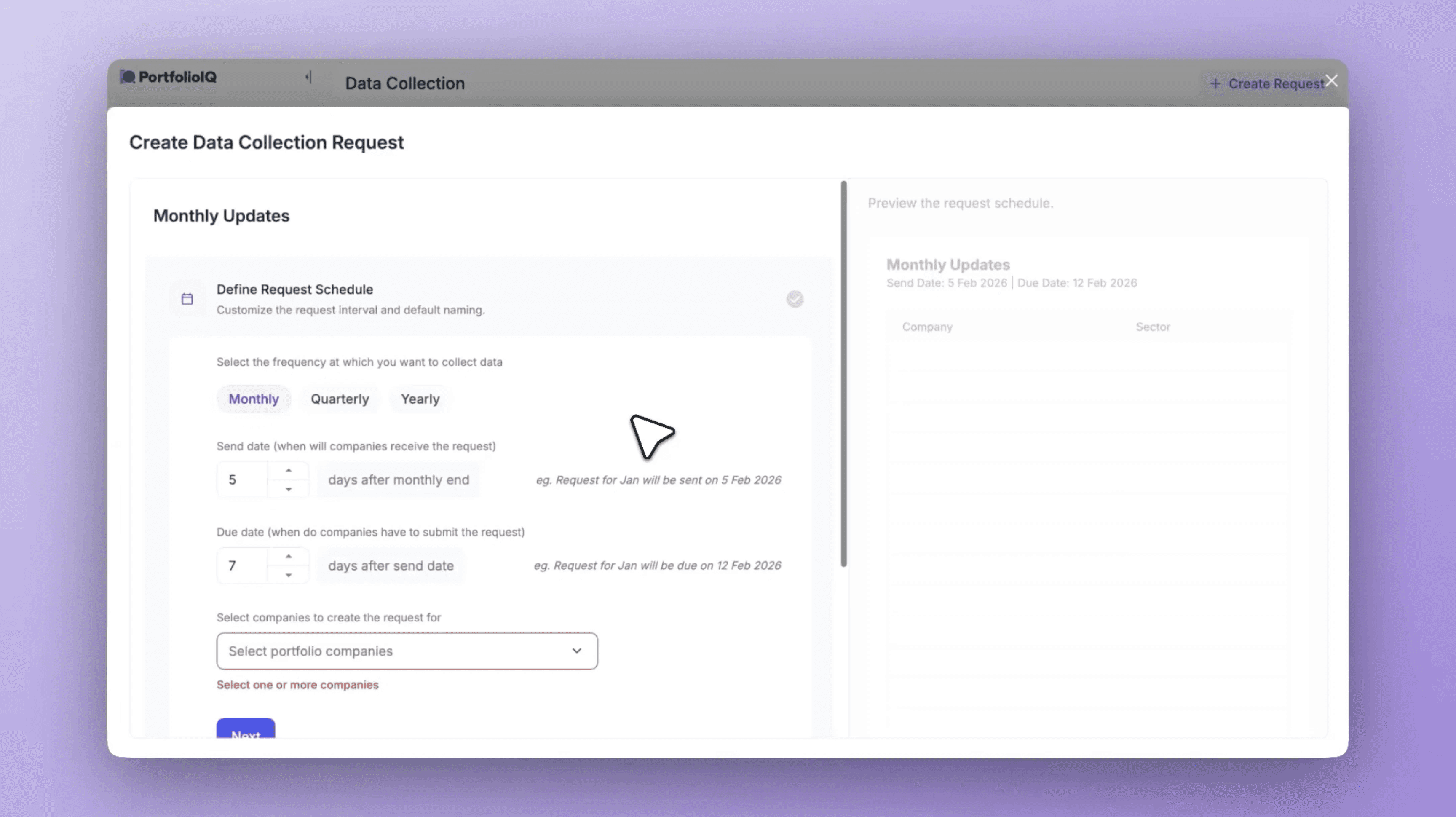 Metrics, frequency and reminders defined upfront - requests go out automatically when data is due.