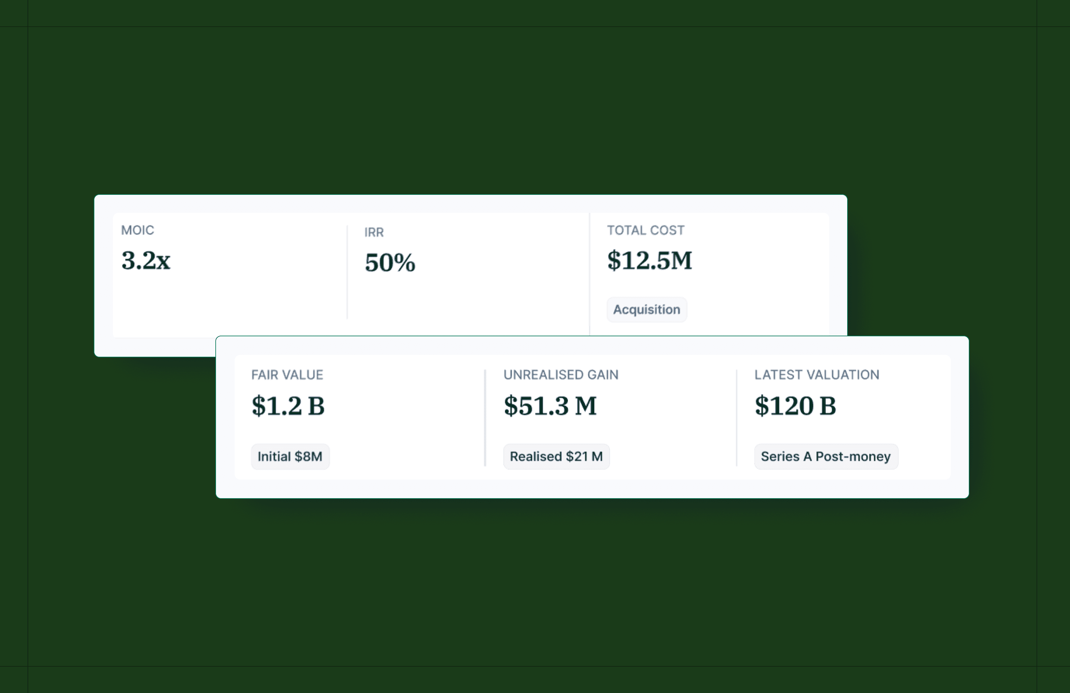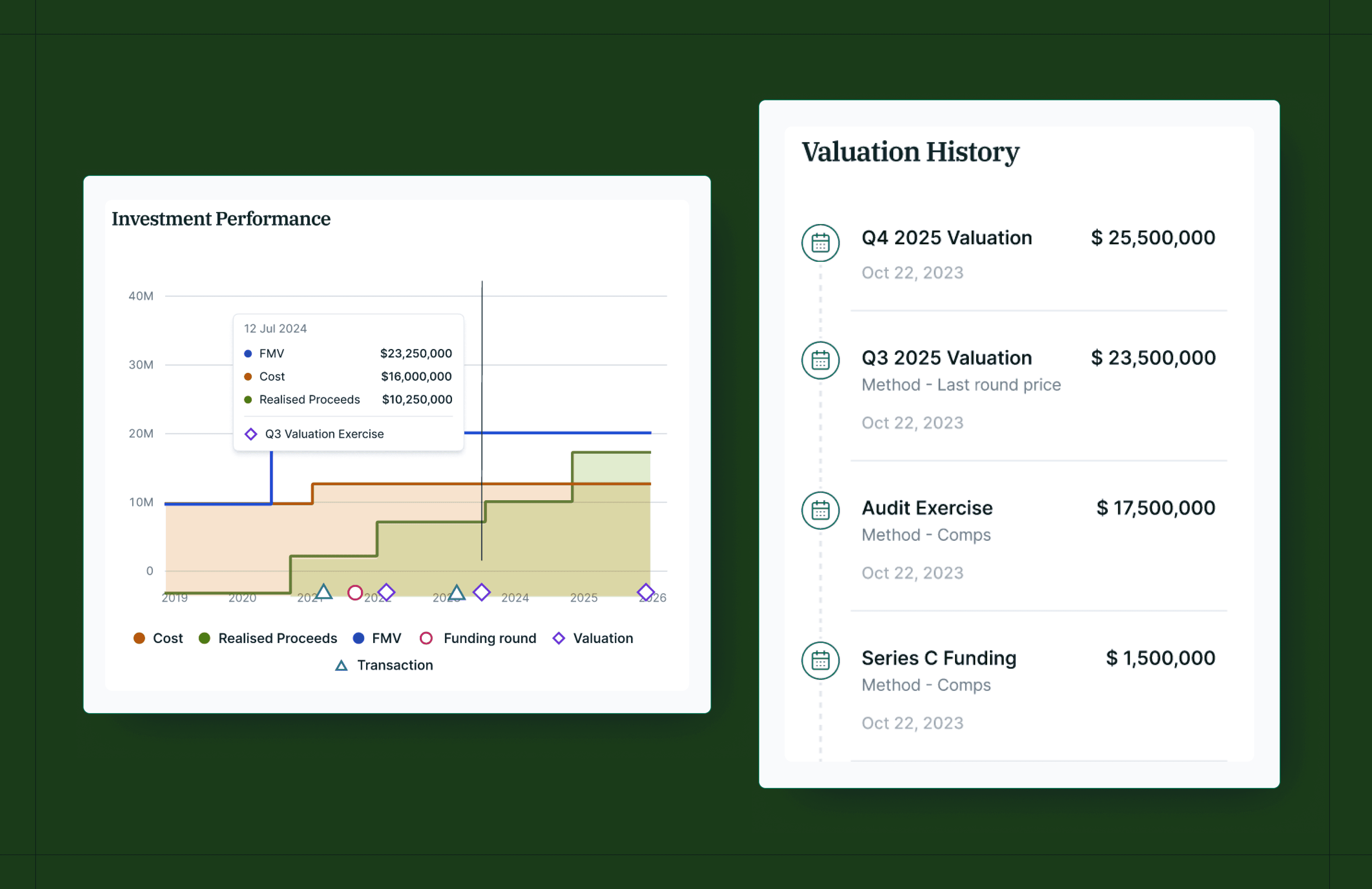Track how the value of your investment has changed over time, with cost, FMV, and every valuation event plotted on the same timeline alongside a complete valuation history.