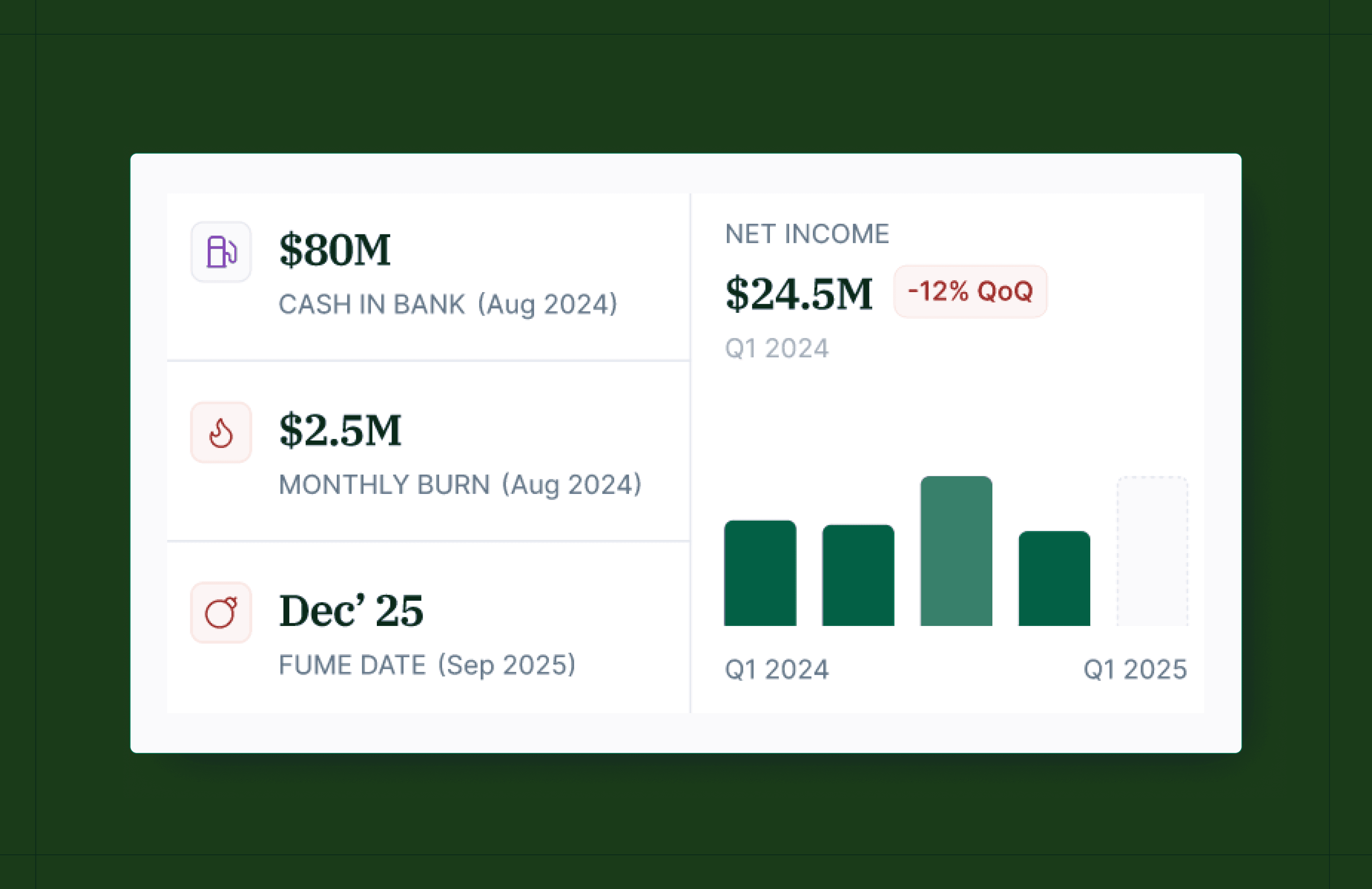 Quick check on the company's cash situation. Cash in bank, monthly burn, FUME date, revenue and net income with quarter-over-quarter changes and trend lines.