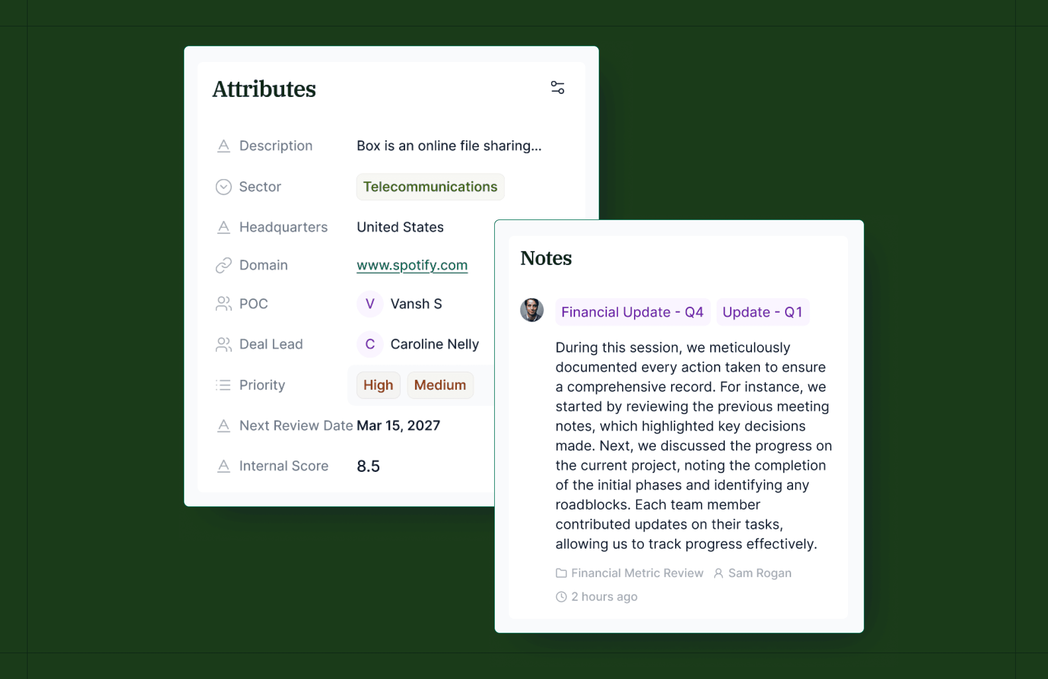Everything your firm tracks internally, the context that lives in someone's memory or a side spreadsheet - now connected to the rest. No silos.