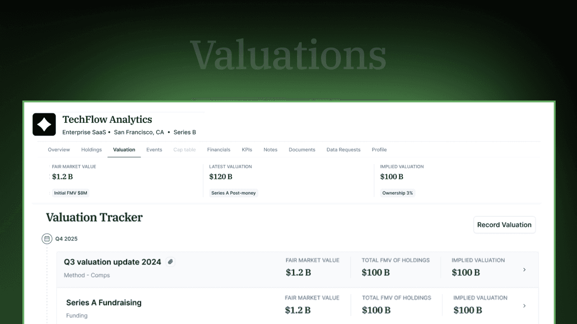 Document Vault organises every file in one place and adds metadata like company, type and source. The most recent board deck, the cap table from last round, the valuation model from 2 years ago — whatever you need, surfaced immediately.