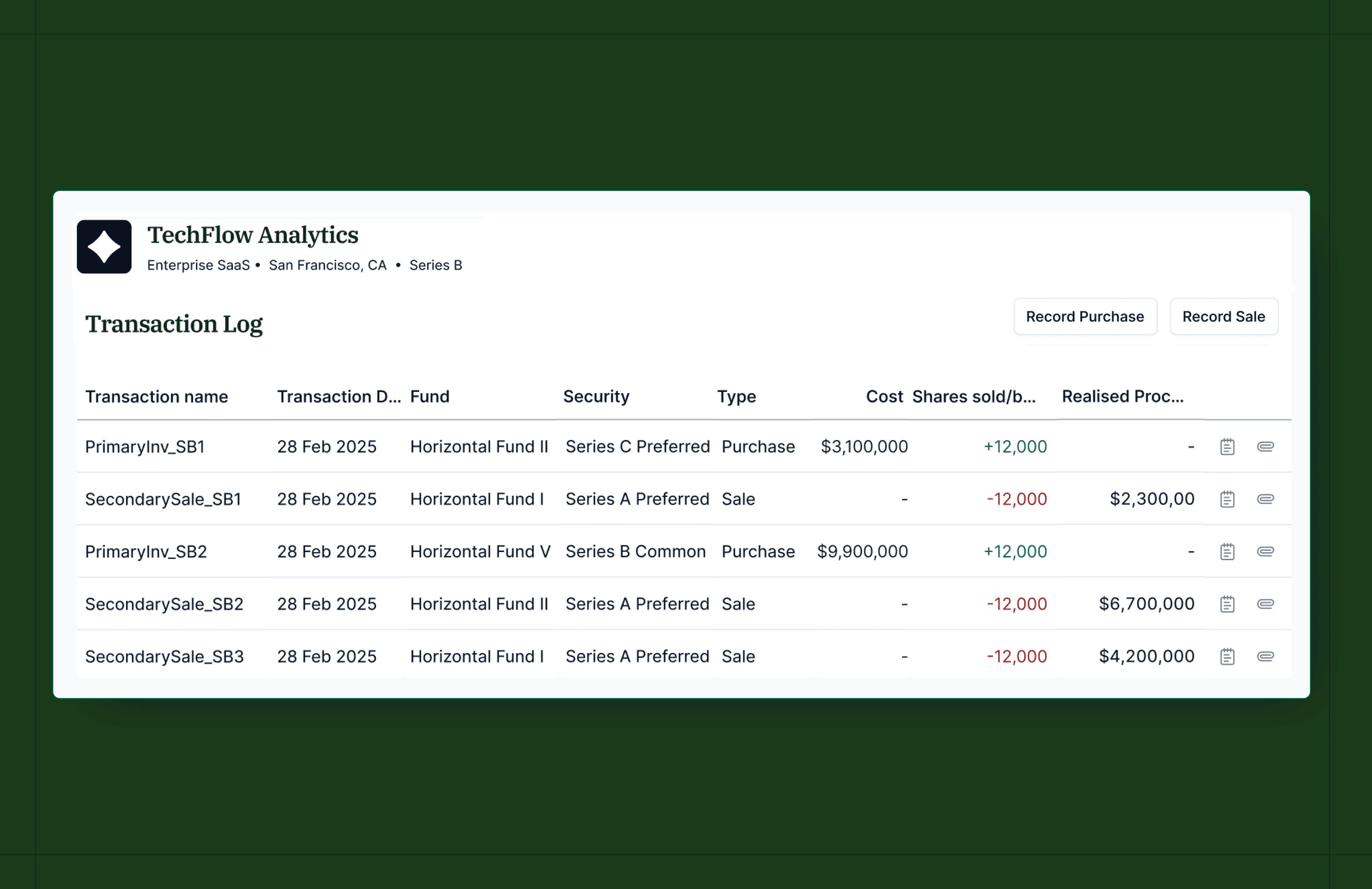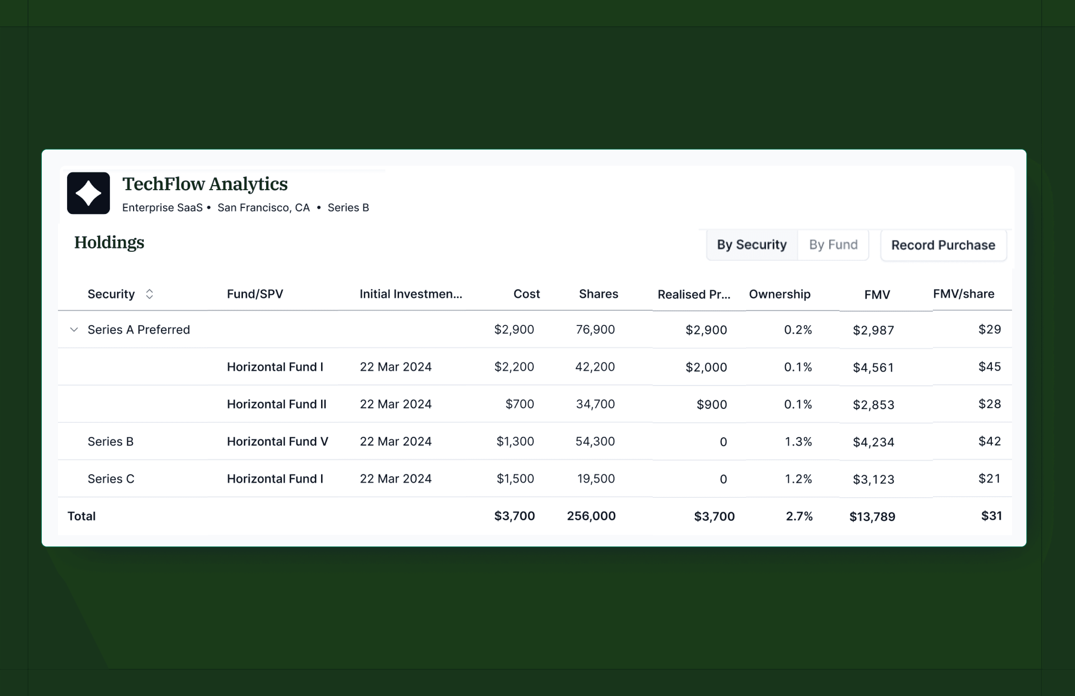 Holdings & Transactions gives you one record per portfolio company, broken down by security or by fund. Log purchases and sales as they happen, and cost, ownership, FMV, and realized proceeds stay tied out across every fund.