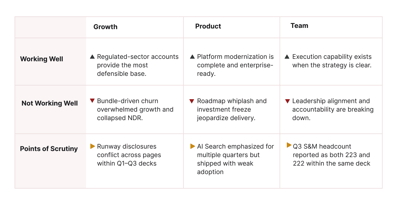 Growth, product, team - what's working, what's not, and what warrants a closer look, built up across quarters from every board deck.