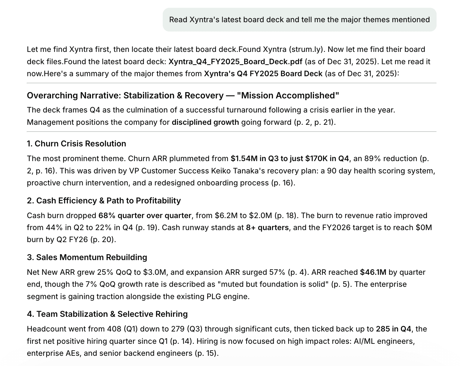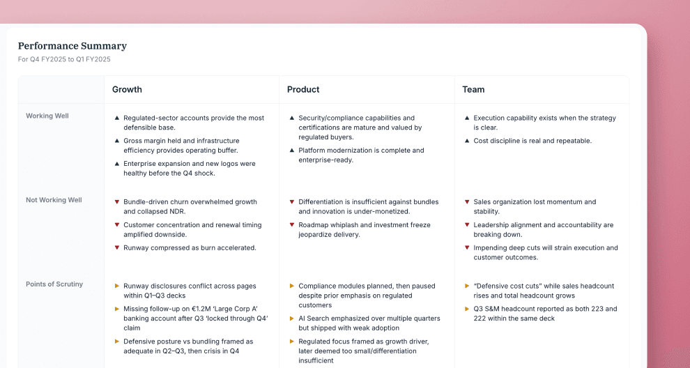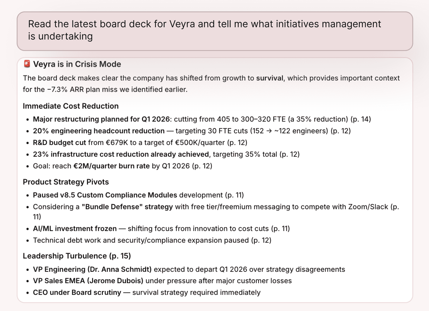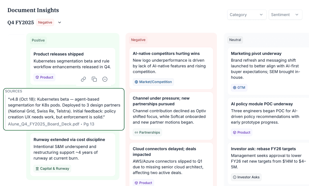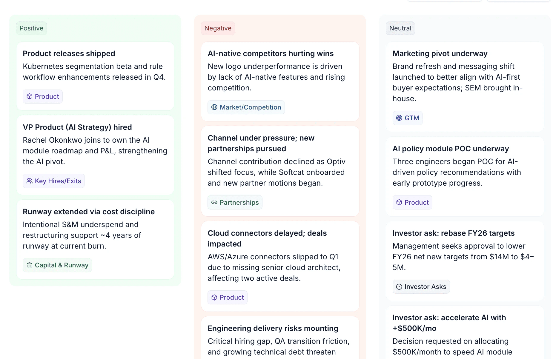 Get more than numbers from your documents. Key themes, risks, and strategic shifts, surfaced automatically from every board deck.