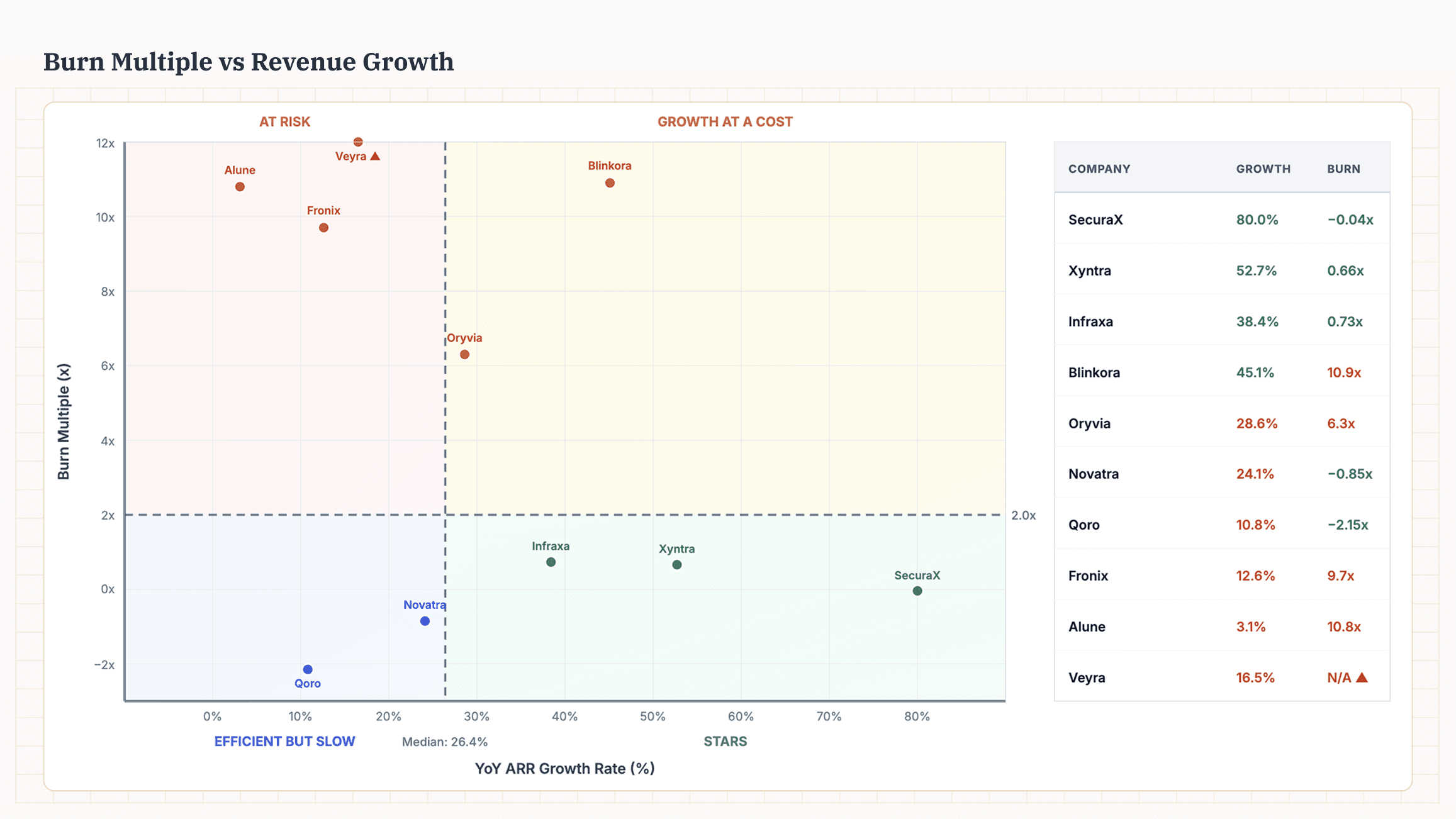 Burn multiple alone is only half the picture. Plot it against growth rate and you can see in one chart which portfolio companies are growing efficiently and which are burning faster than they're growing.