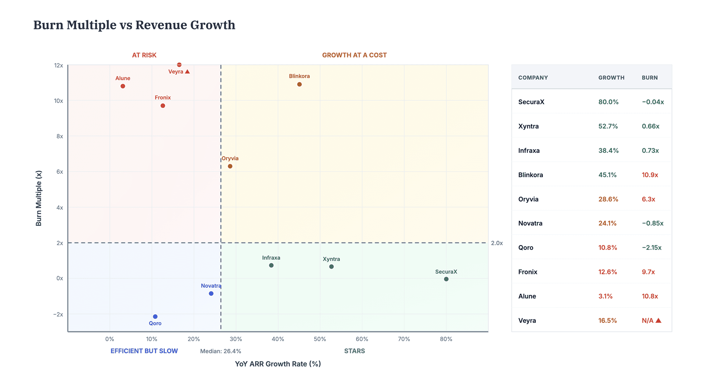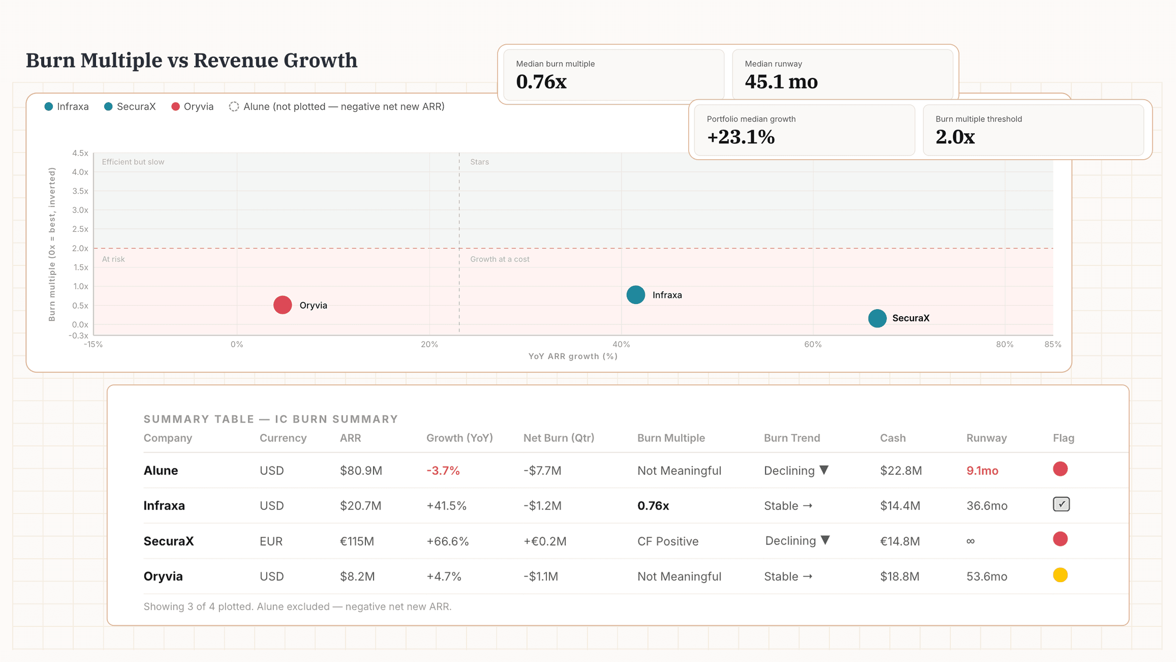 Burn multiple alone is only half the picture. Plot it against growth rate and you can see in one chart which portfolio companies are growing efficiently and which are burning faster than they're growing.